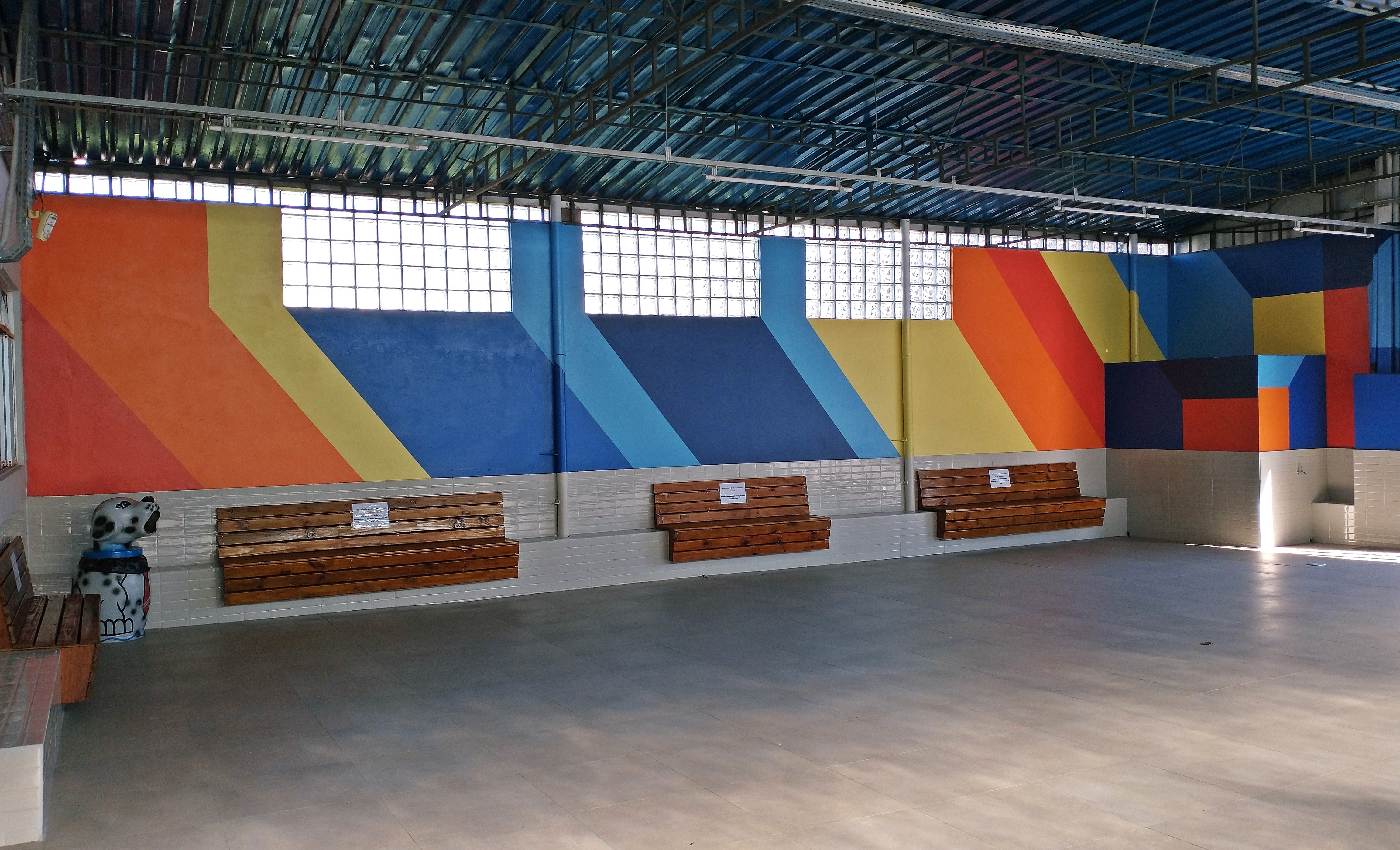 Para o retrofit da fachada do Colégio, foram criados elementos que permitem maior incidência de luz e ventilação para o pátio de recreação coberto, que também recebe novo layout e mobiliário. Resgatando o universo lúdico da criança, a nova paginação recebe o grafite geométrico que resulta em uma gentileza urbana para o bairo.