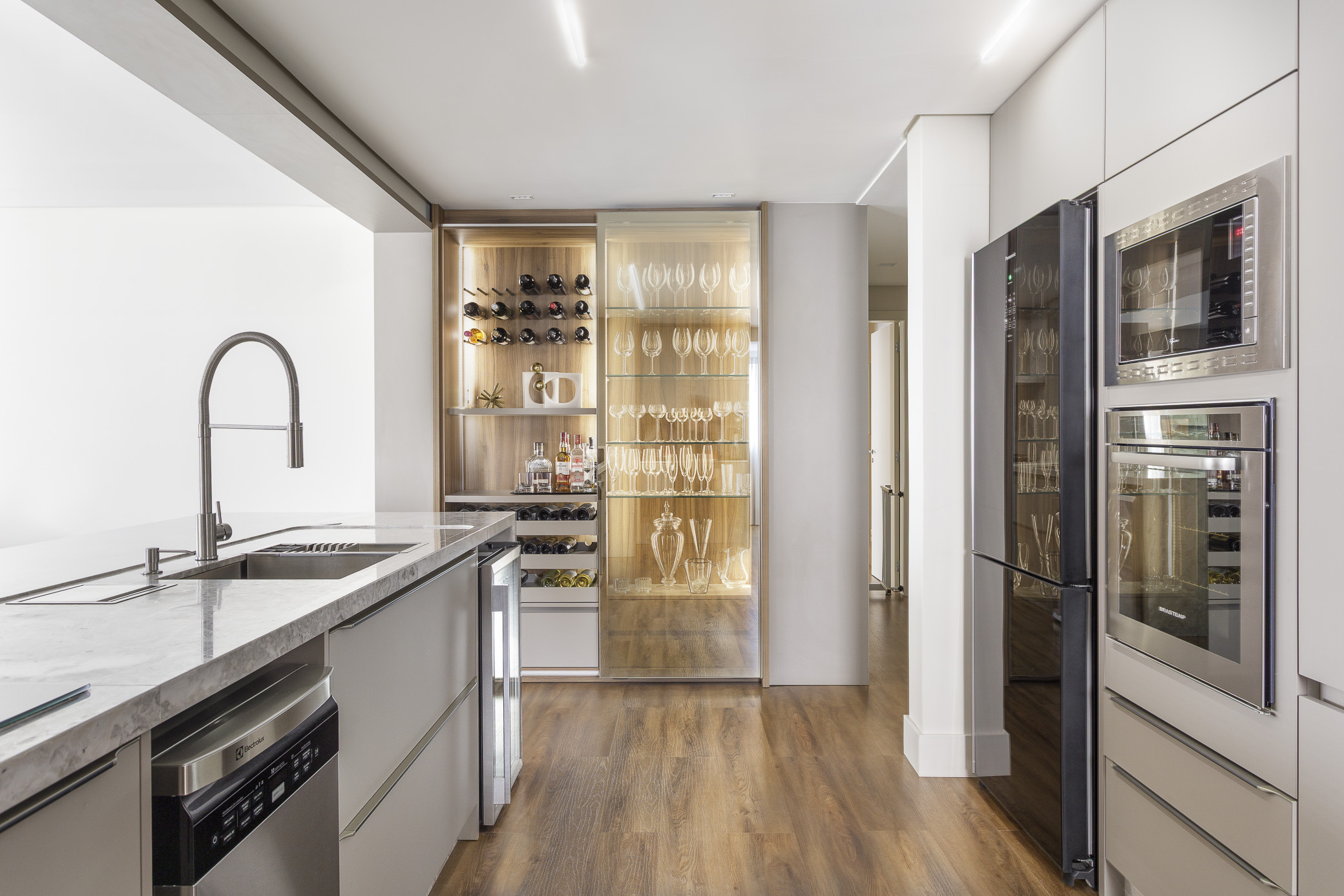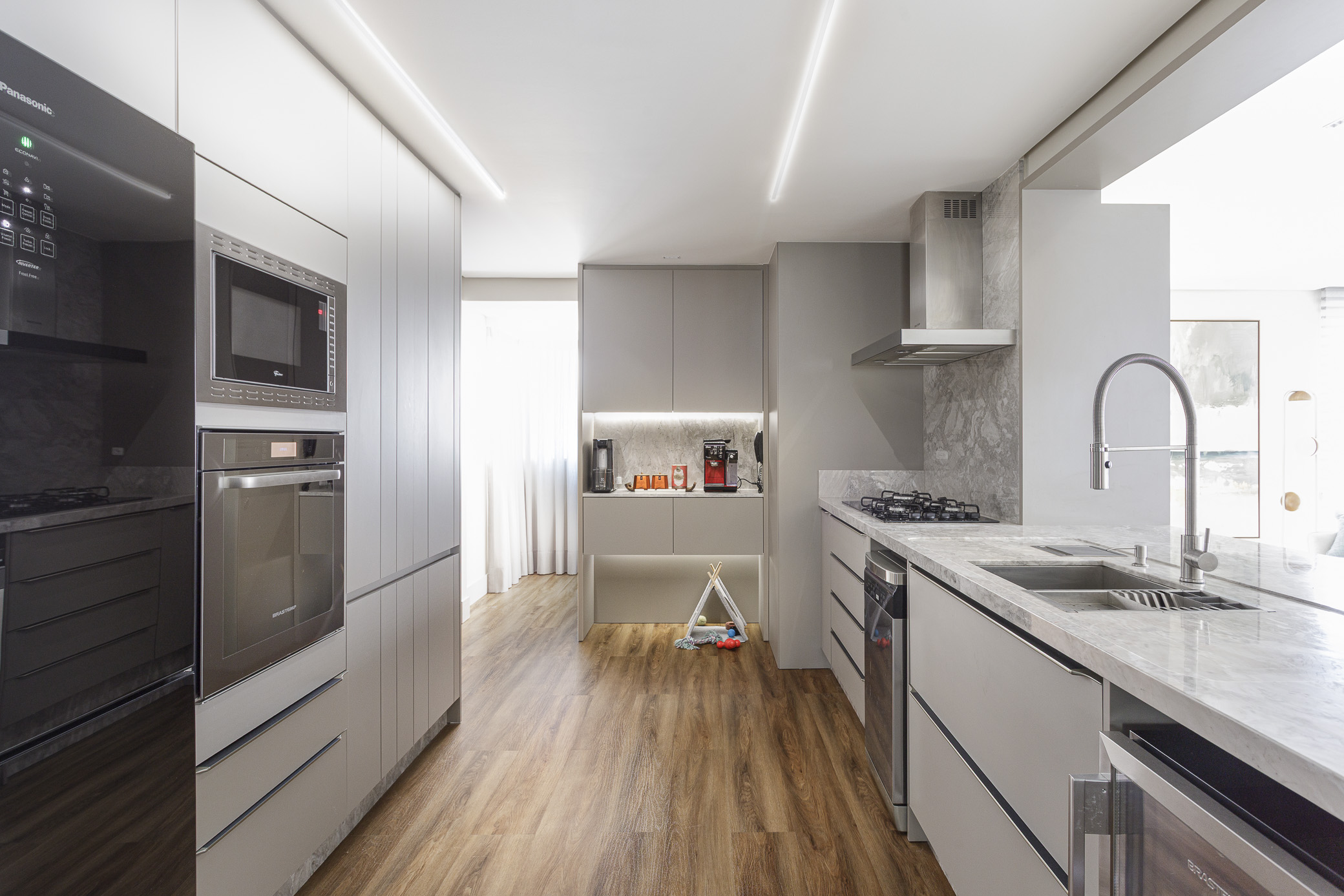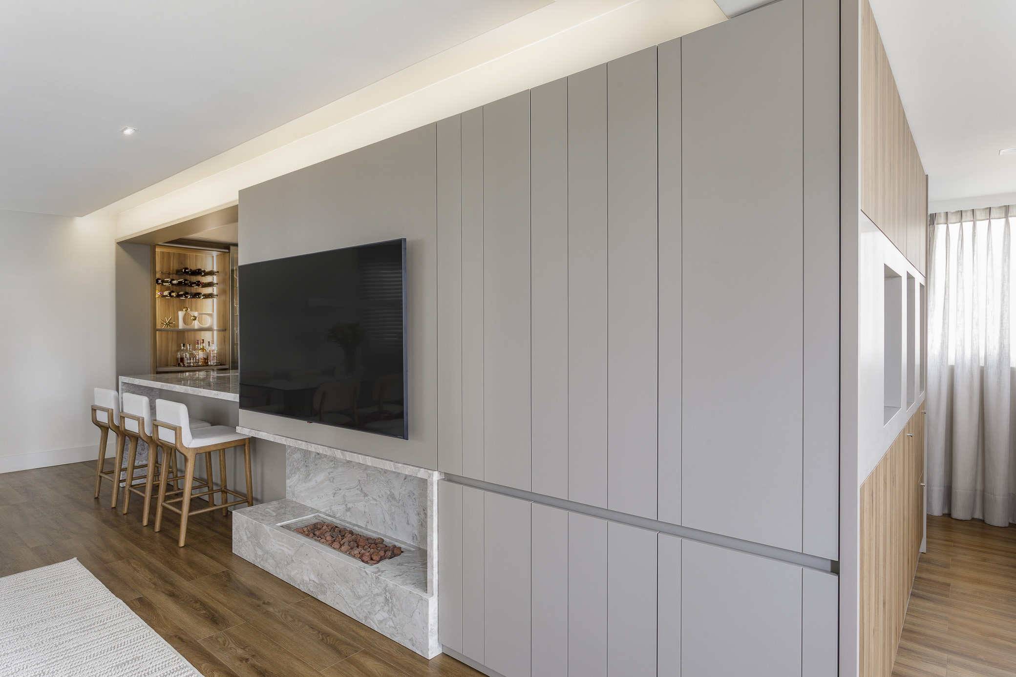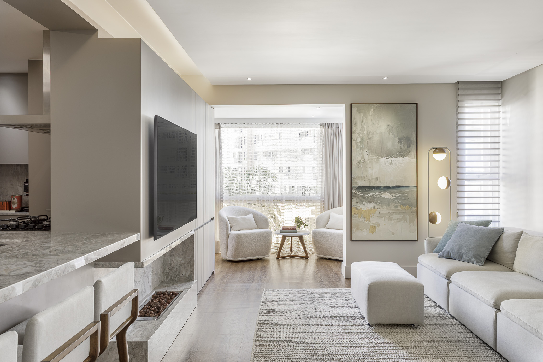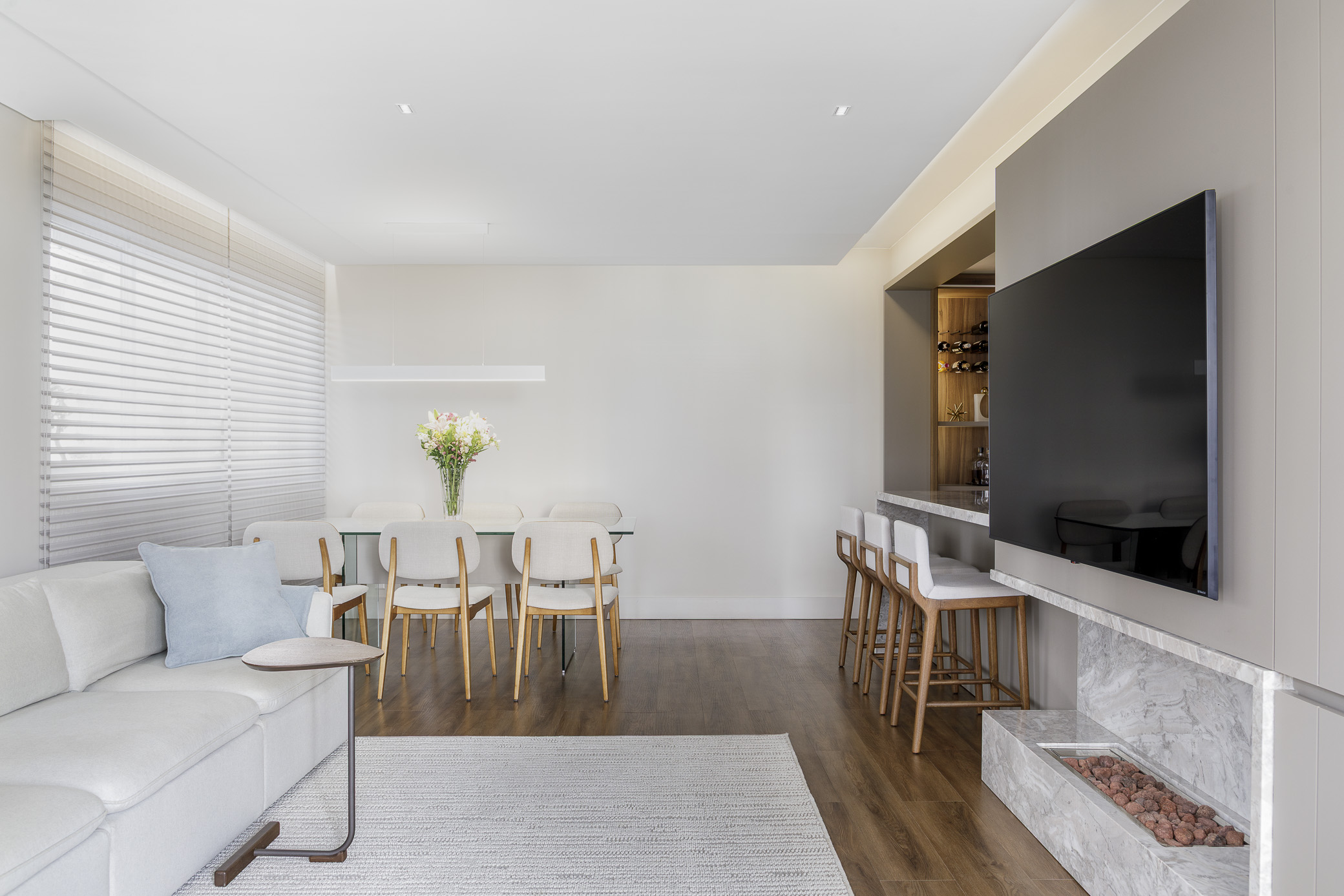 A principal intervenção aconteceu na área social, onde integramos sala, cozinha e varanda, criando um ambiente único, amplo e mais convidativo para o convívio familiar. A nova bancada delimita sutilmente os espaços e se tornou o ponto central da casa — com um bar junto à cristaleira, solicitado pelos clientes, que acrescenta charme e praticidade ao dia a dia.