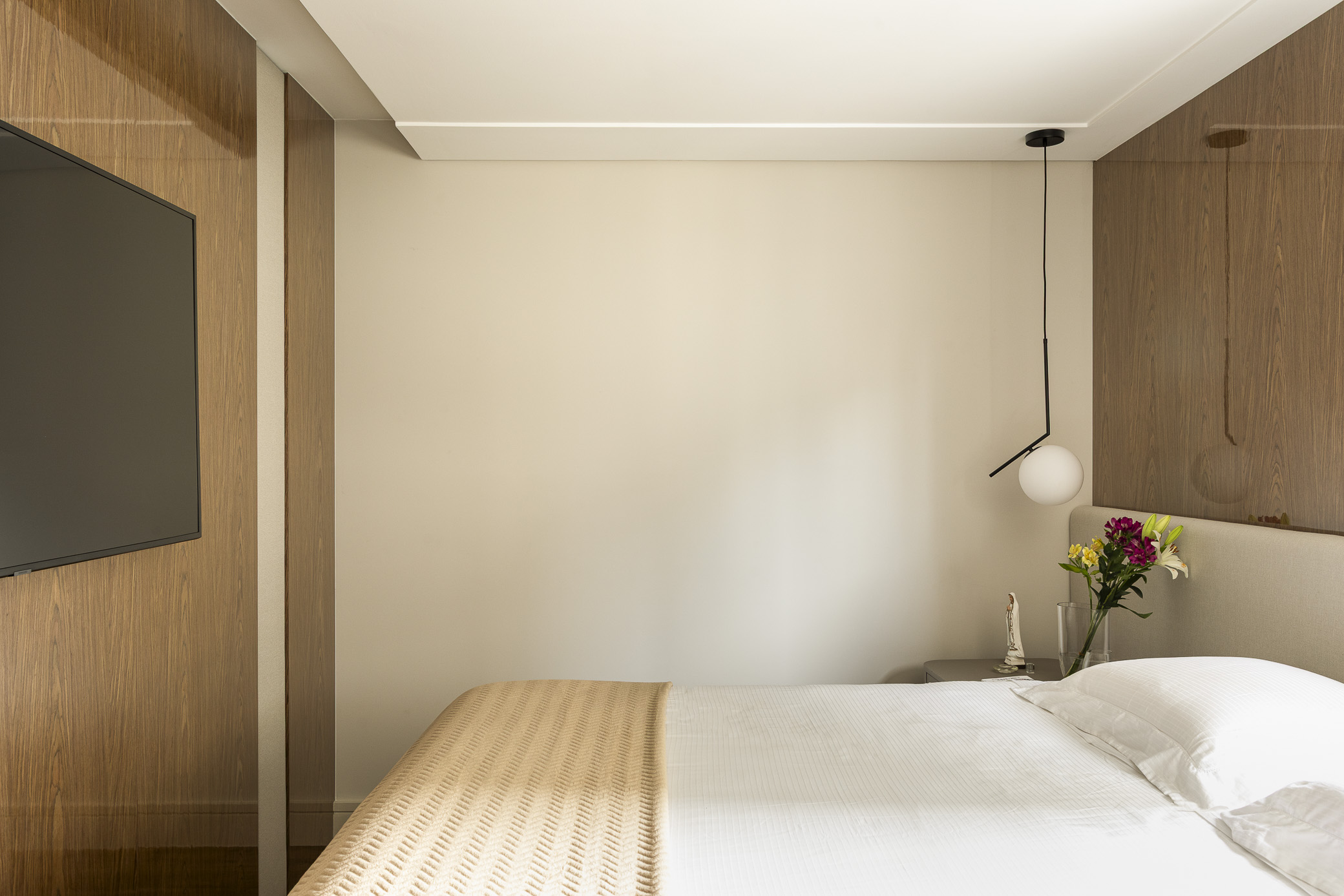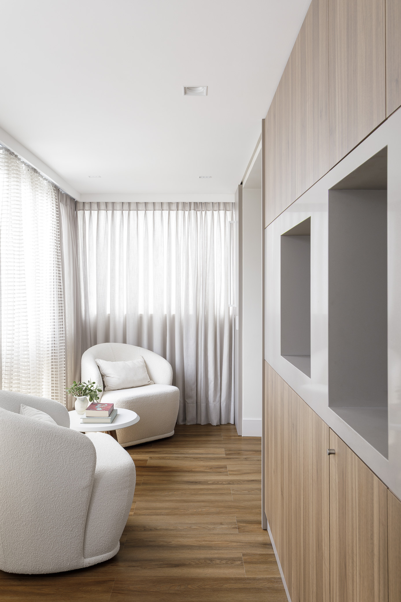 As áreas íntimas também foram repensadas: suíte master, quarto da filha e escritório passaram por reconfiguração, com soluções que otimizam o uso dos espaços e alinham estética e funcionalidade.