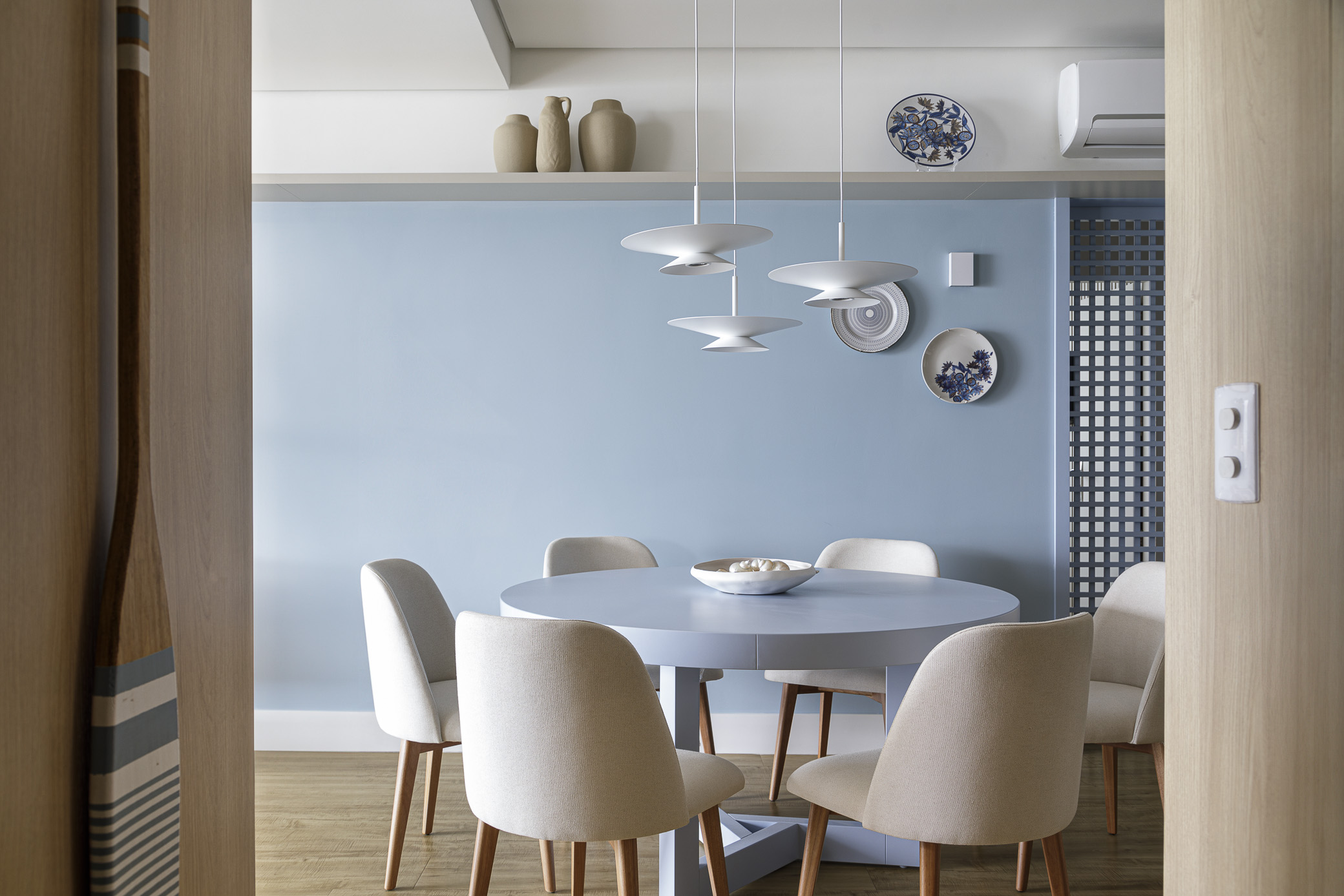 A reforma, realizada em duas etapas, abrangeu desde a escolha dos revestimentos até o design de novos móveis e peças soltas, criando um ambiente funcional e despojado. O resultado é um ambiente leve, acolhedor e descontraído, onde a família encontra seu refúgio à beira-mar e recebe amigos para celebrar a vida com conforto e leveza.