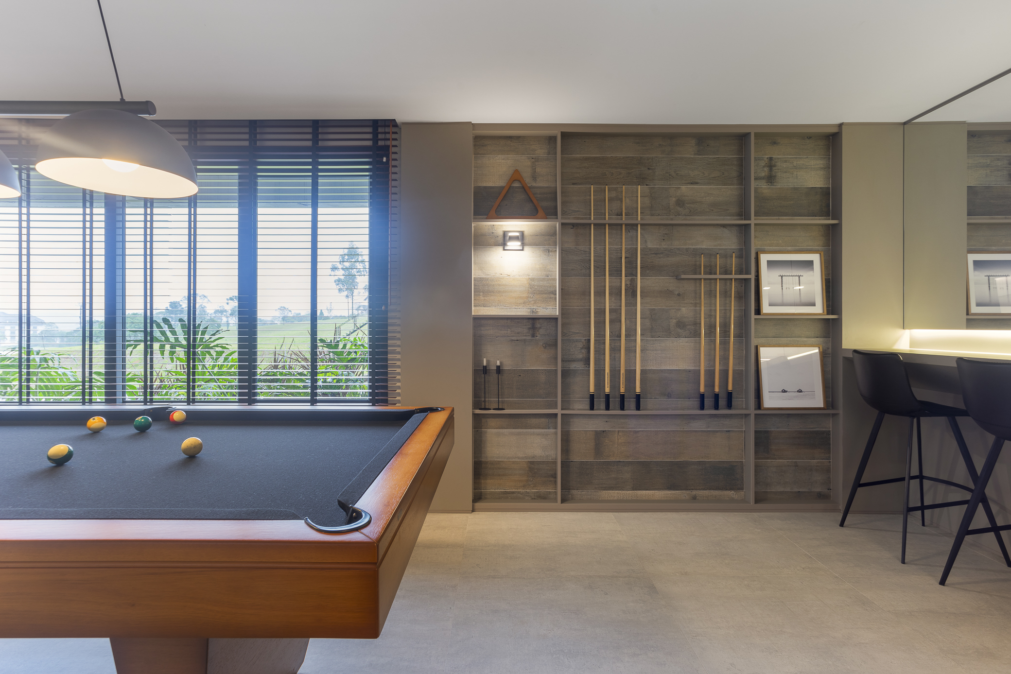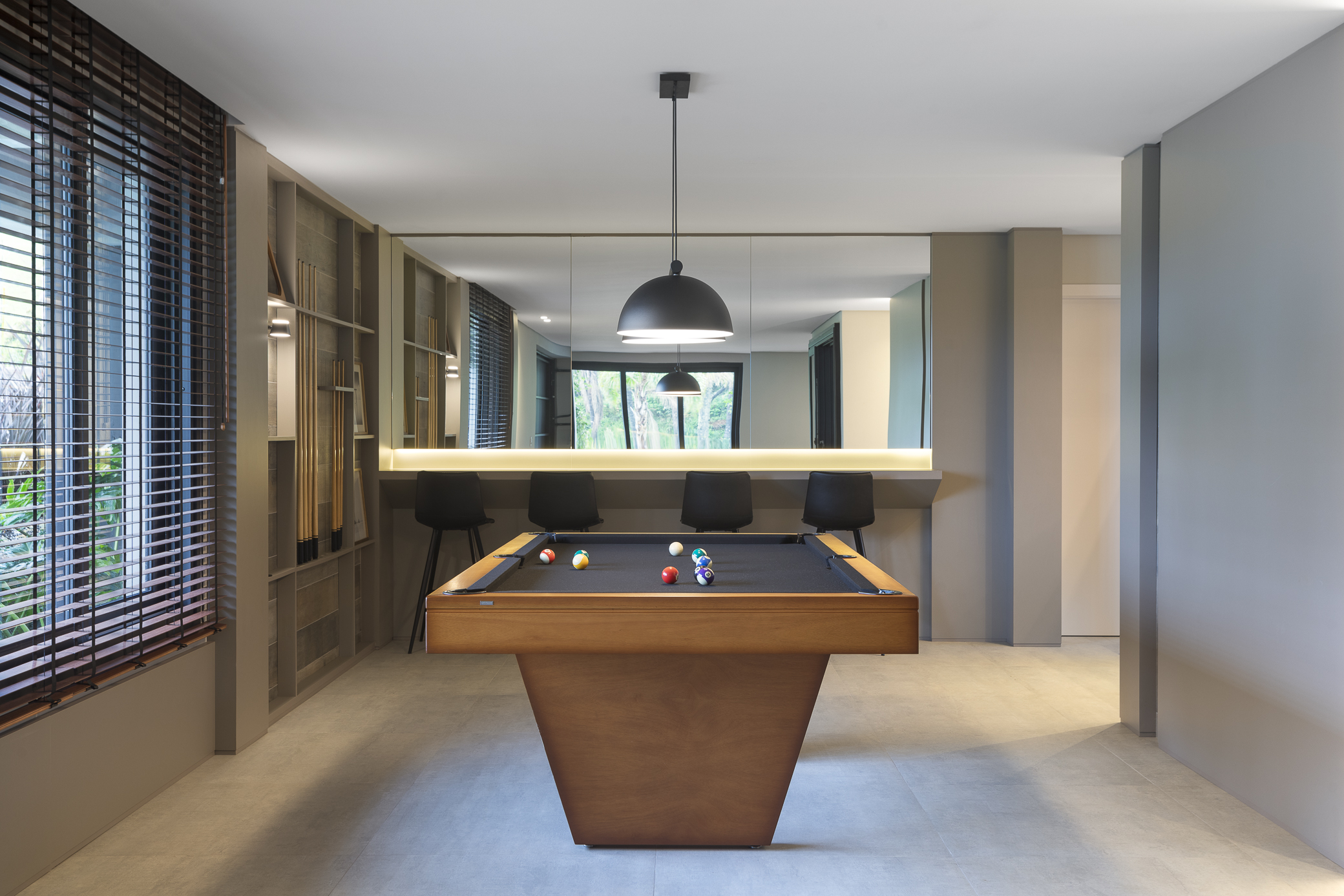 Novos espaços, como spa, sauna e ampla área gourmet foram acrescentados ao projeto no pavimento térreo. No pavimento inferior, sala de jogos e adega, e área e de serviço, banheiro e quarto de hóspedes.