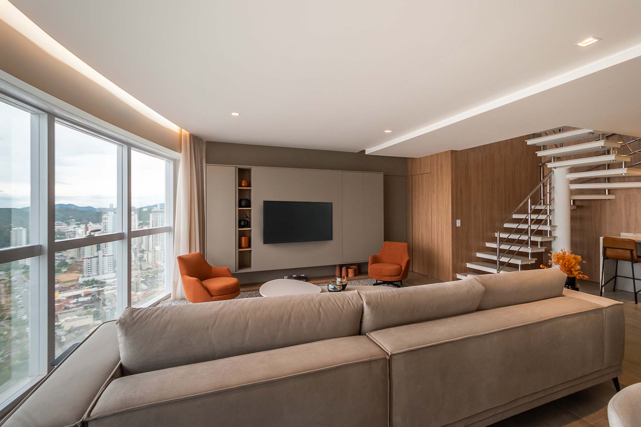 Com vista para a marina de Itajaí, esta cobertura duplex foi projetada para maximizar a interação entre os espaços internos e a paisagem, oferecendo conforto, funcionalidade e momentos de lazer. O projeto destaca uma integração fluida entre os pavimentos, proporcionando uma experiência única de habitar.