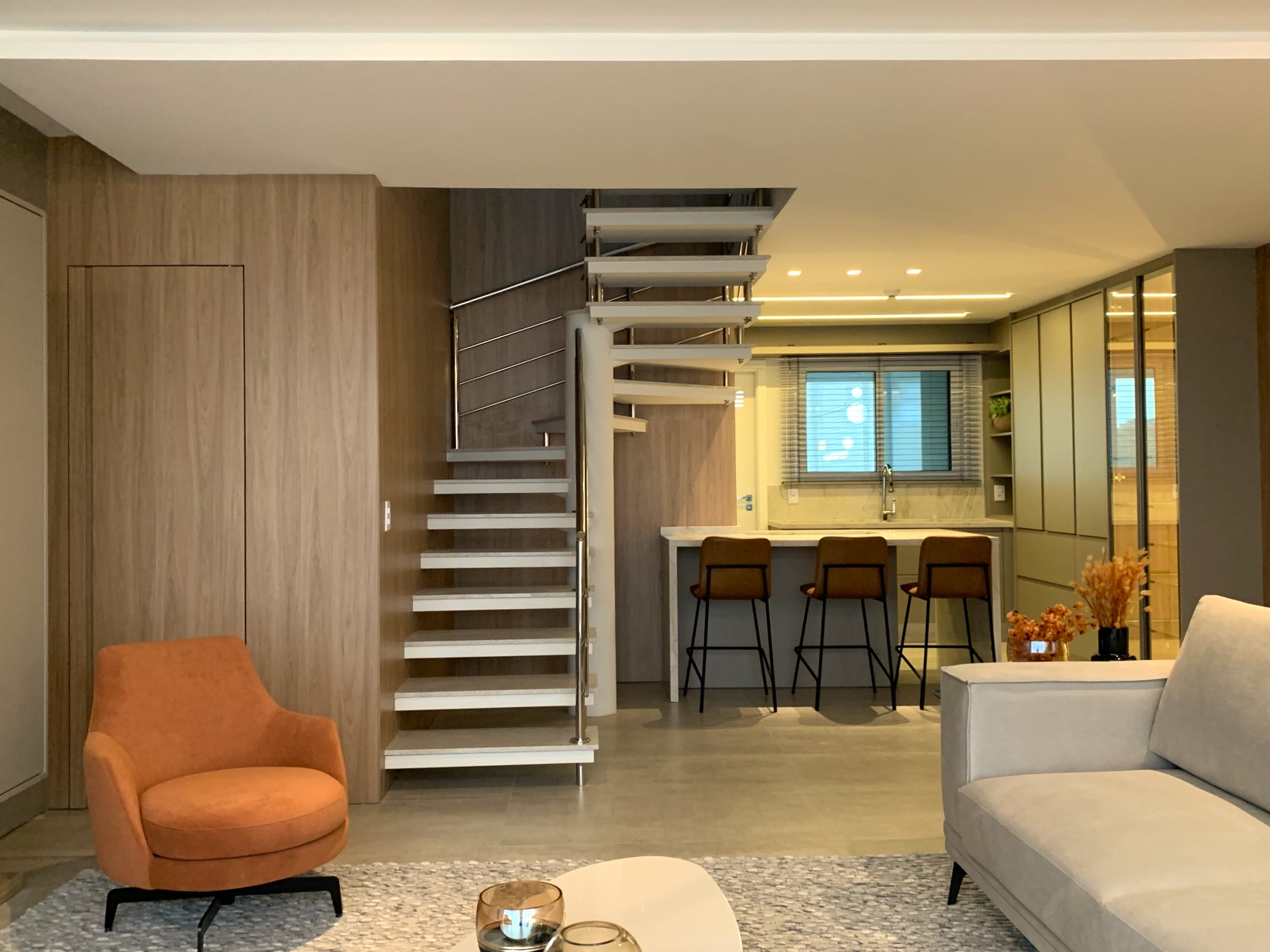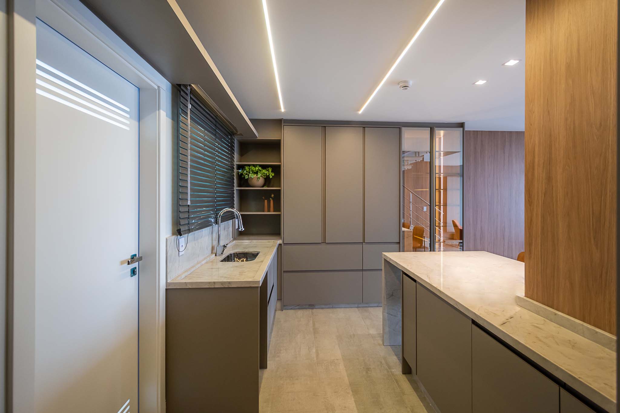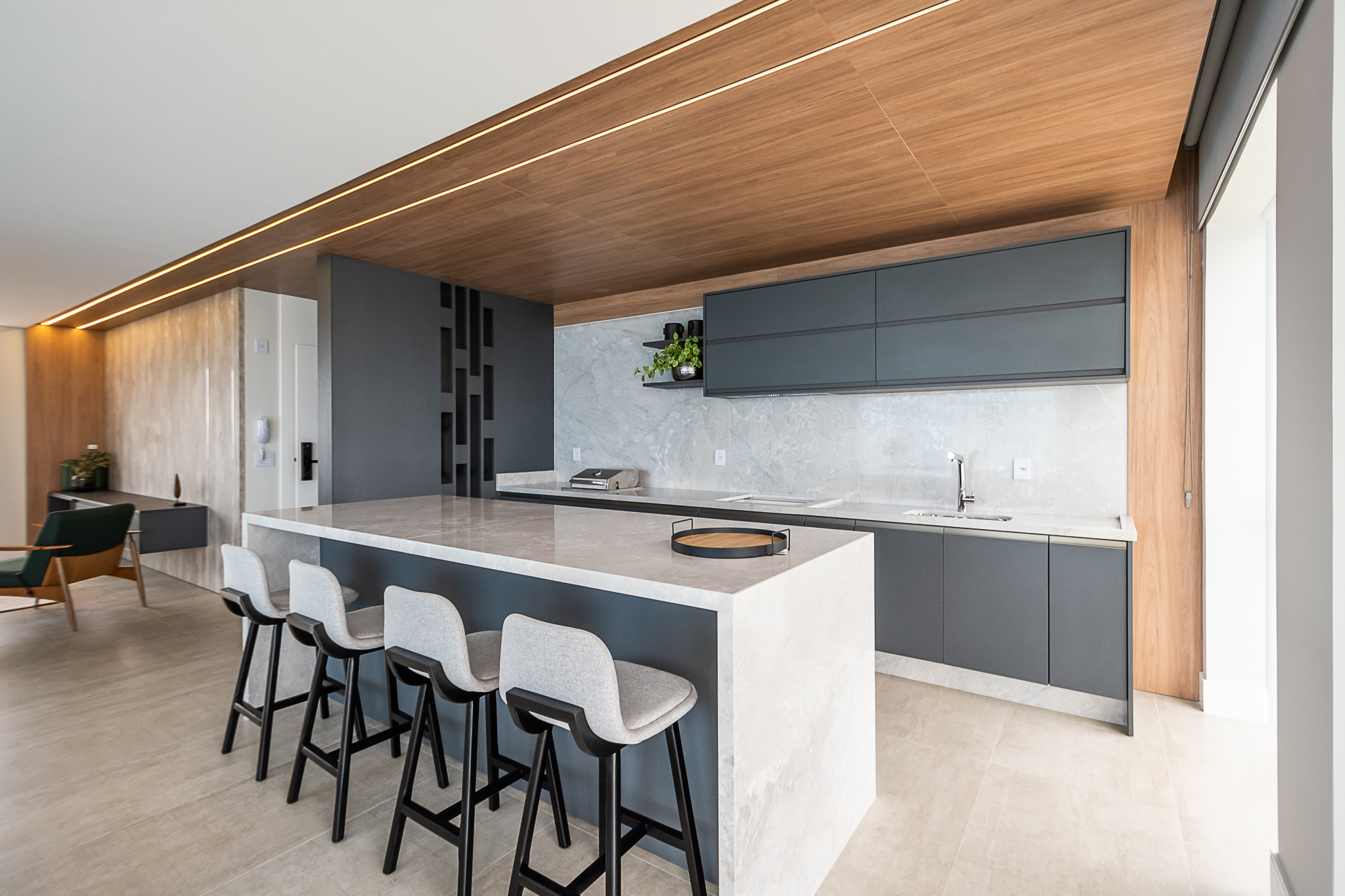 Painéis amadeirados ocultam lavabo e integram o living à cozinha, assim como fazem a conexão entre os pavimentos de forma harmônica e contínua.