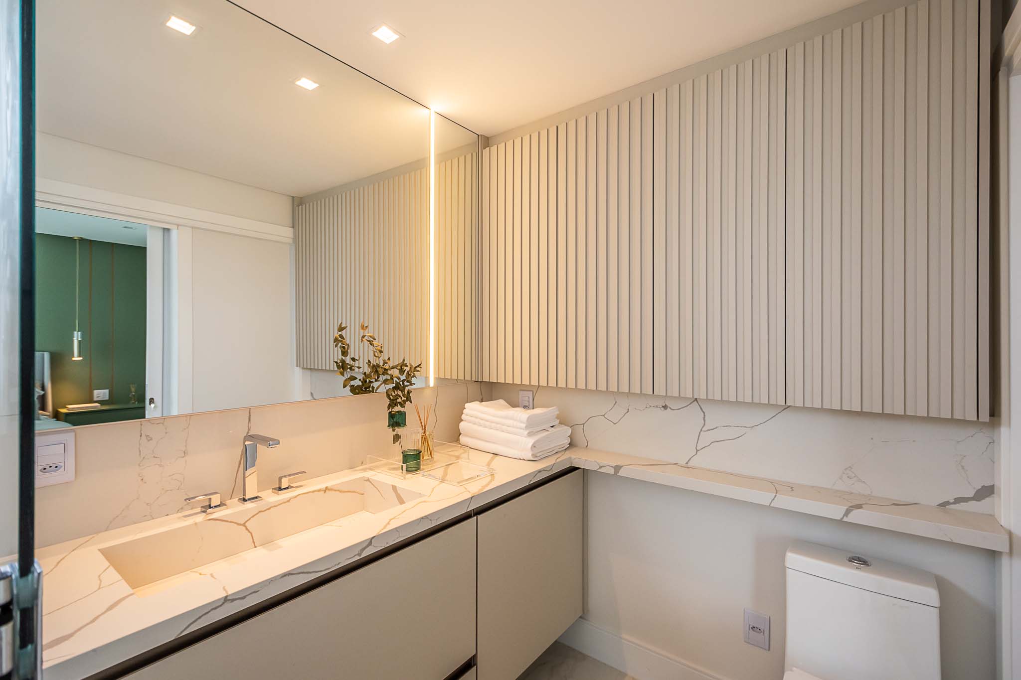 A base neutra dos acabamentos e móveis planejados proporciona equilíbrio e sofisticação, enquanto o mobiliário selecionado ganha destaque ao ser complementado por peças decorativas que imprimem personalidade e charme ao ambiente.