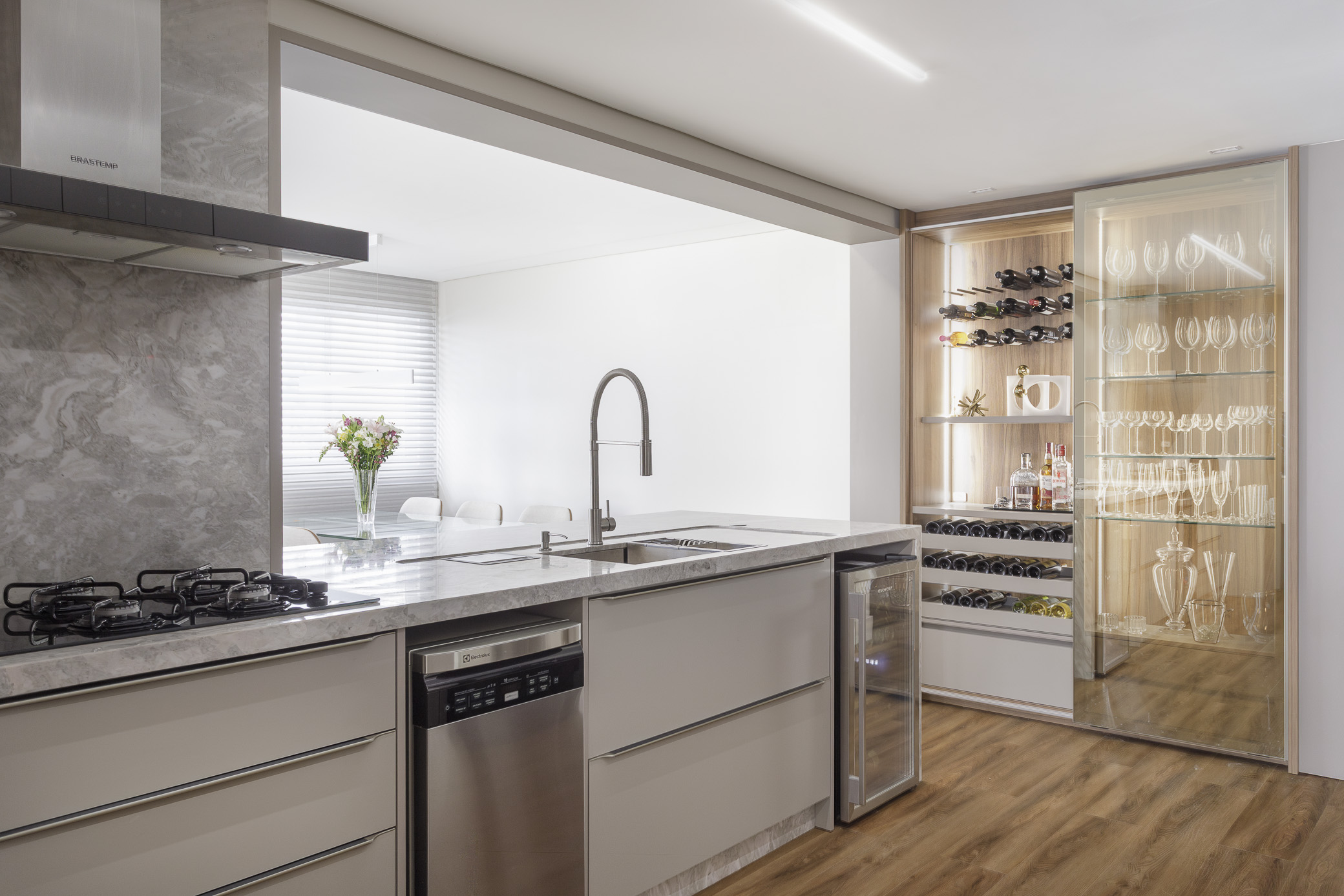 A principal intervenção aconteceu na área social, onde integramos sala, cozinha e varanda, criando um ambiente único, amplo e mais convidativo para o convívio familiar. A nova bancada delimita sutilmente os espaços e se tornou o ponto central da casa — com um bar junto à cristaleira, solicitado pelos clientes, que acrescenta charme e praticidade ao dia a dia.