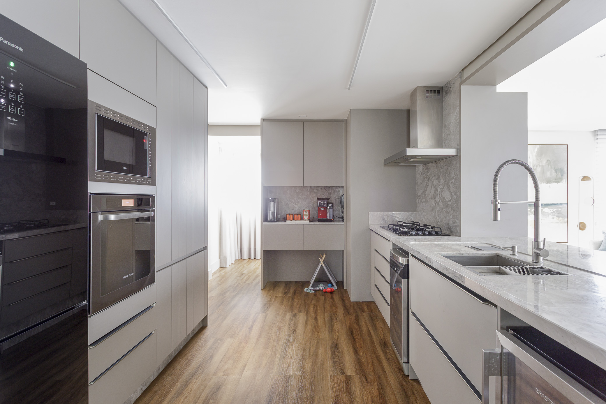 As áreas íntimas também foram repensadas: suíte master, quarto da filha e escritório passaram por reconfiguração, com soluções que otimizam o uso dos espaços e alinham estética e funcionalidade.