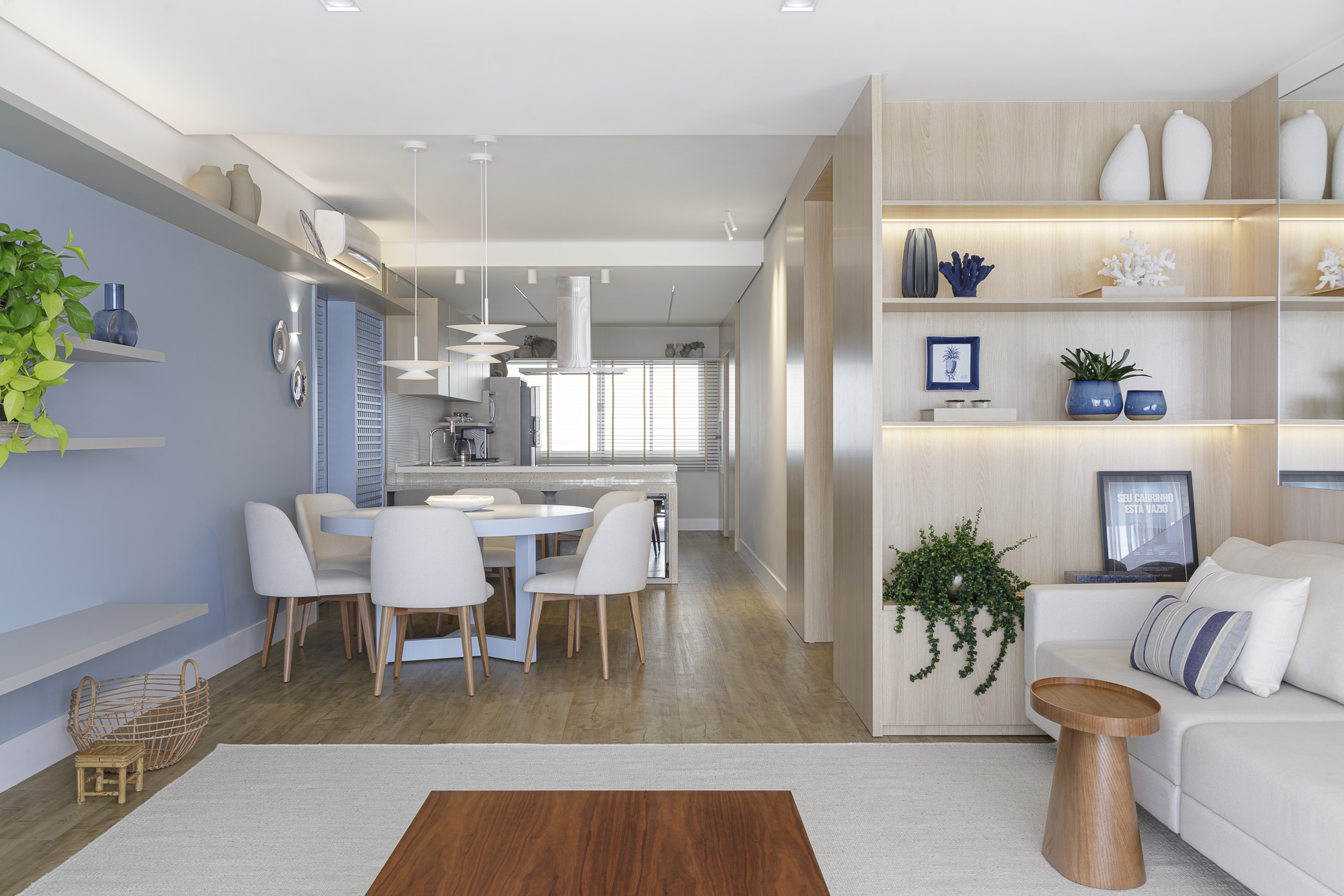 A reforma, realizada em duas etapas, abrangeu desde a escolha dos revestimentos até o design de novos móveis e peças soltas, criando um ambiente funcional e despojado. O resultado é um ambiente leve, acolhedor e descontraído, onde a família encontra seu refúgio à beira-mar e recebe amigos para celebrar a vida com conforto e leveza.