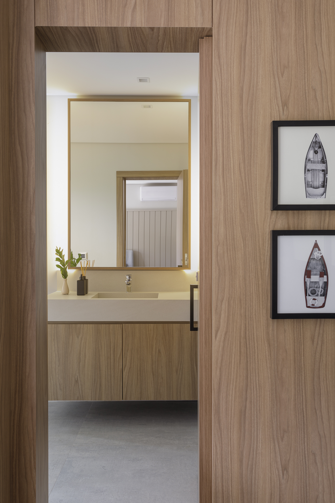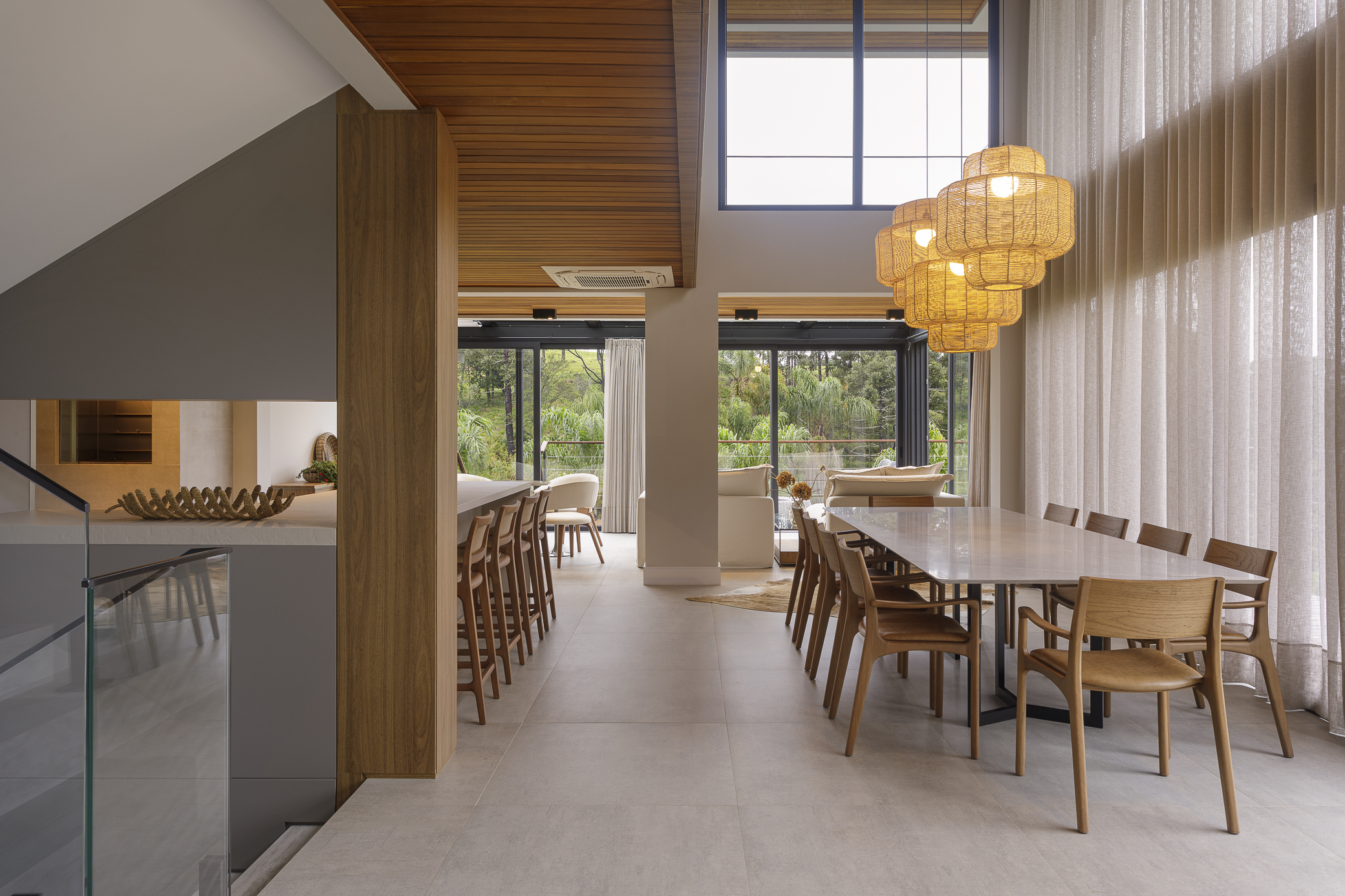 O pavimento principal, térreo, é dedicado à área social, amplo e integrado, proporcionando uma transição fluida entre os espaços e reforçando o convívio familiar.