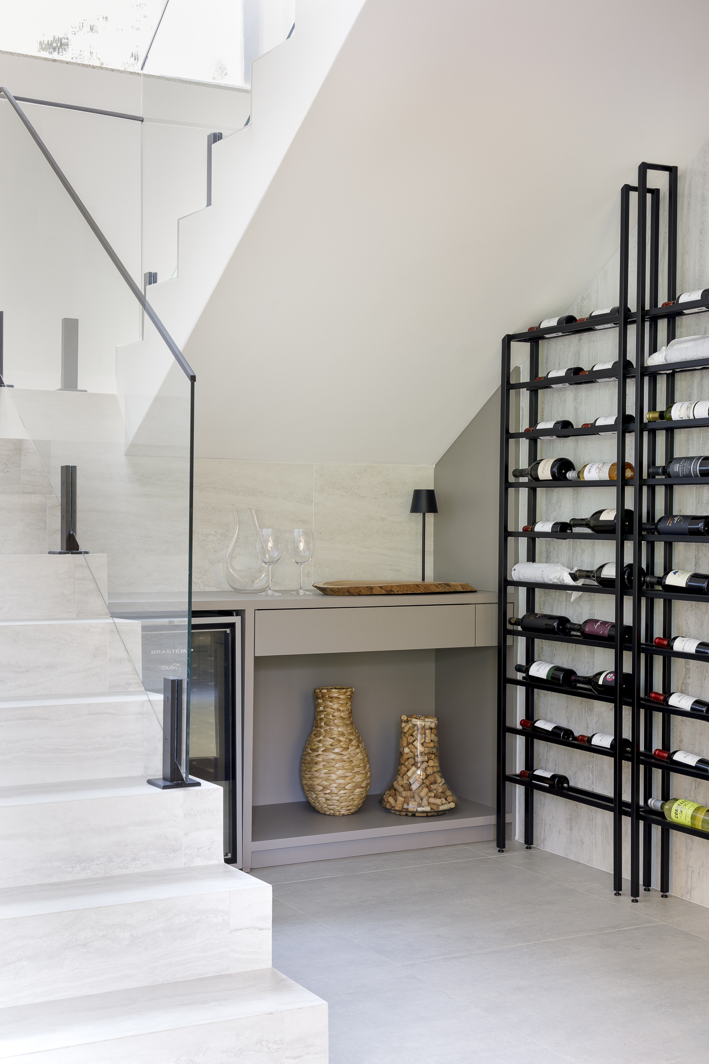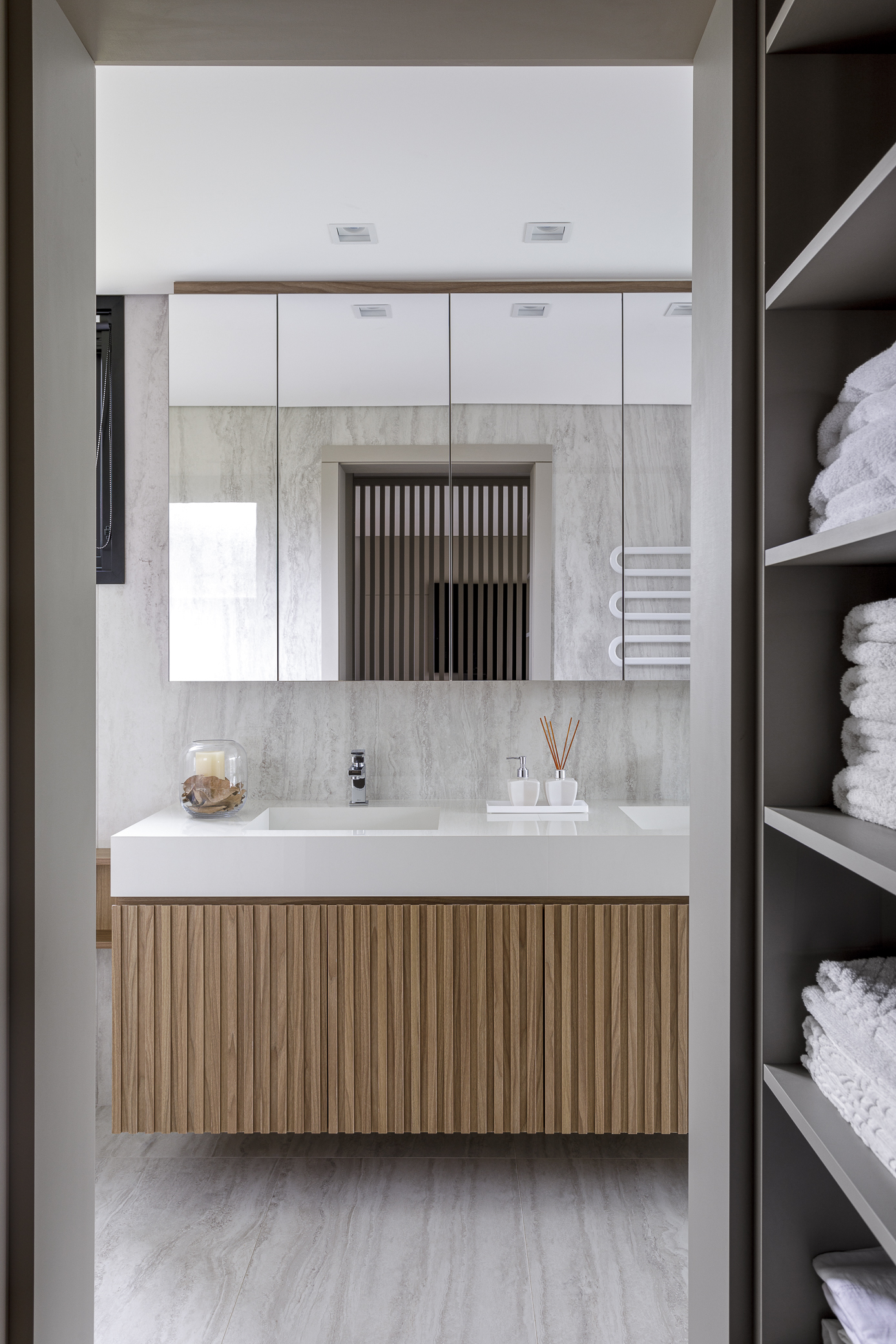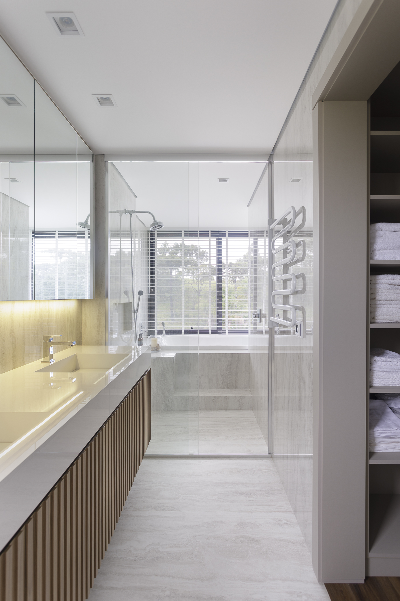 Novos espaços, como spa, sauna e ampla área gourmet foram acrescentados ao projeto no pavimento térreo. No pavimento inferior, sala de jogos e adega, e área e de serviço, banheiro e quarto de hóspedes.