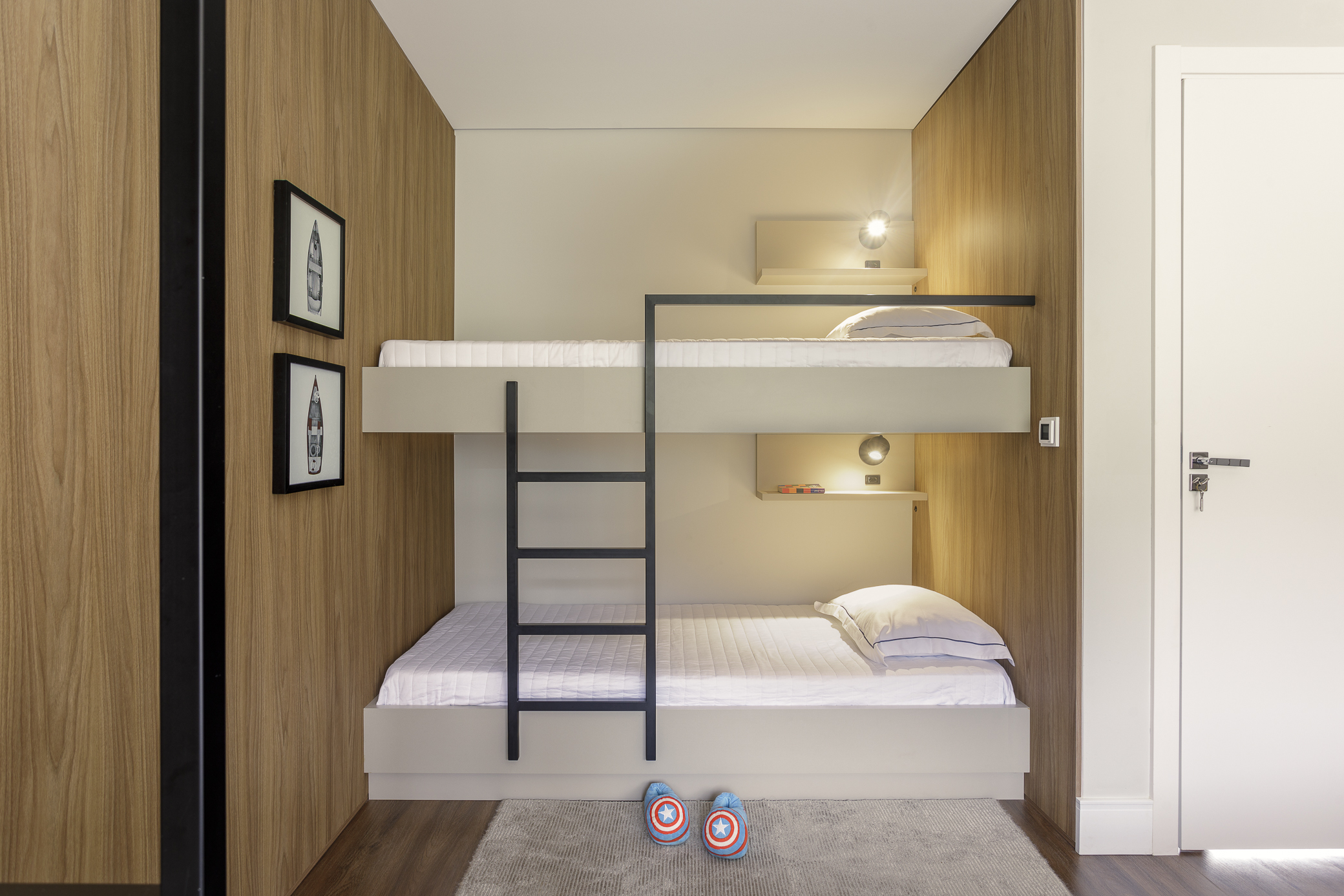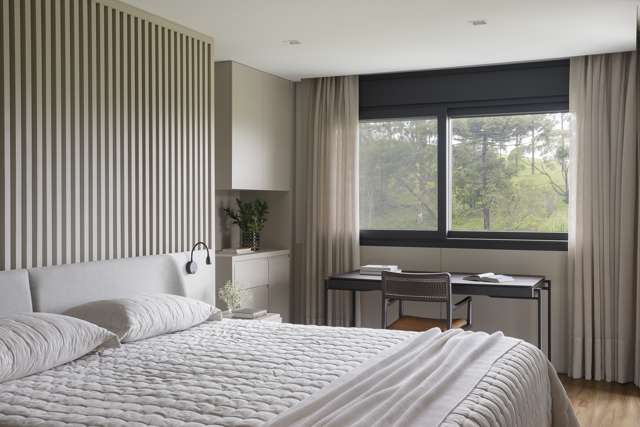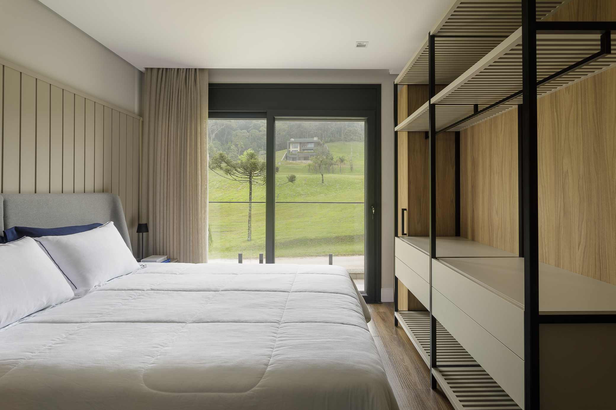No pavimento superior, que abriga três suítes, o acesso por meio de um mezanino proporciona vistas deslumbrantes da paisagem da serra e reforça a integração dos ambientes do pavimento térreo.