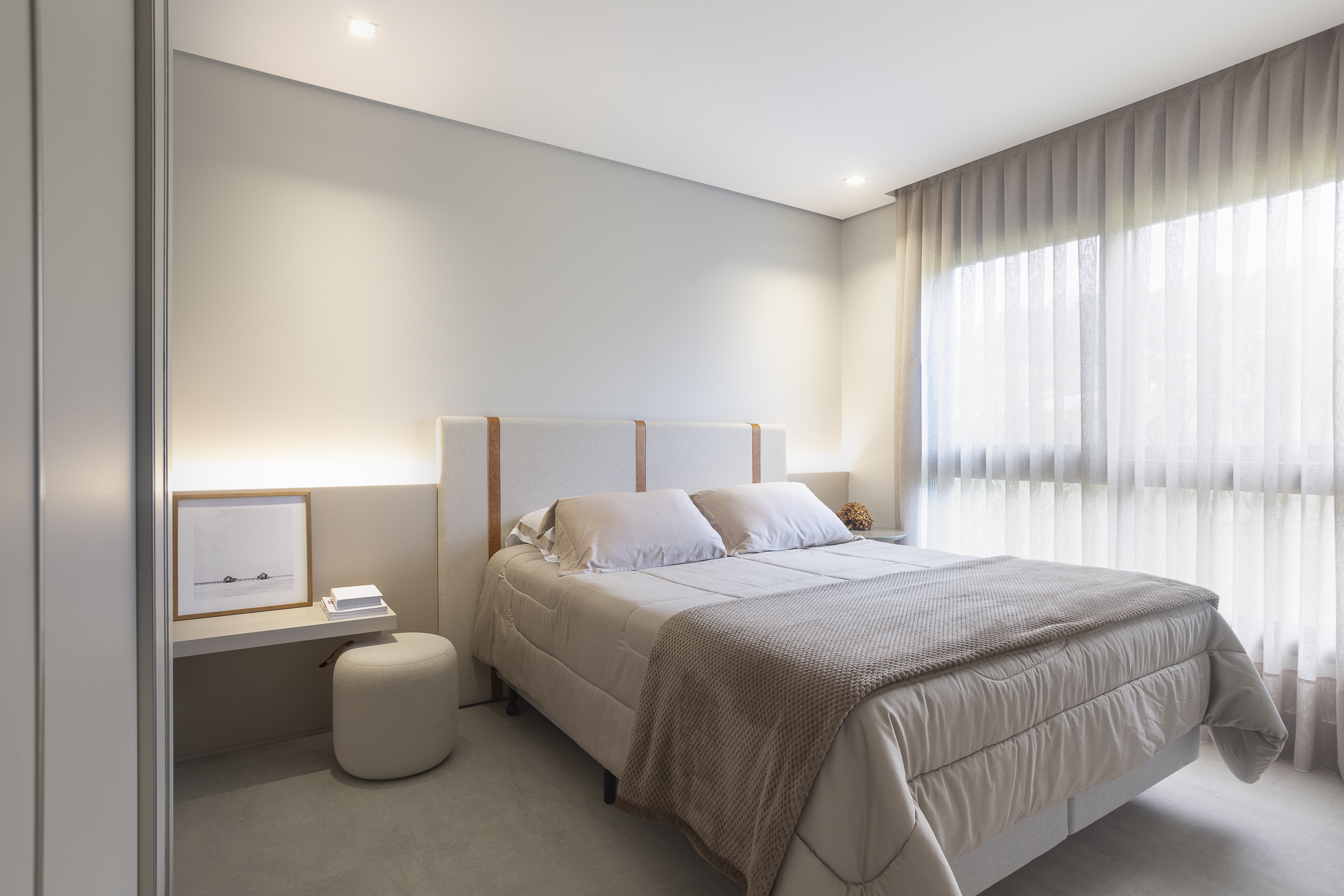 Também, projeto de arquitetura de interiores, com desenho de mobiliário, especificação de móveis soltos, cortinas, persianas, e enxoval.