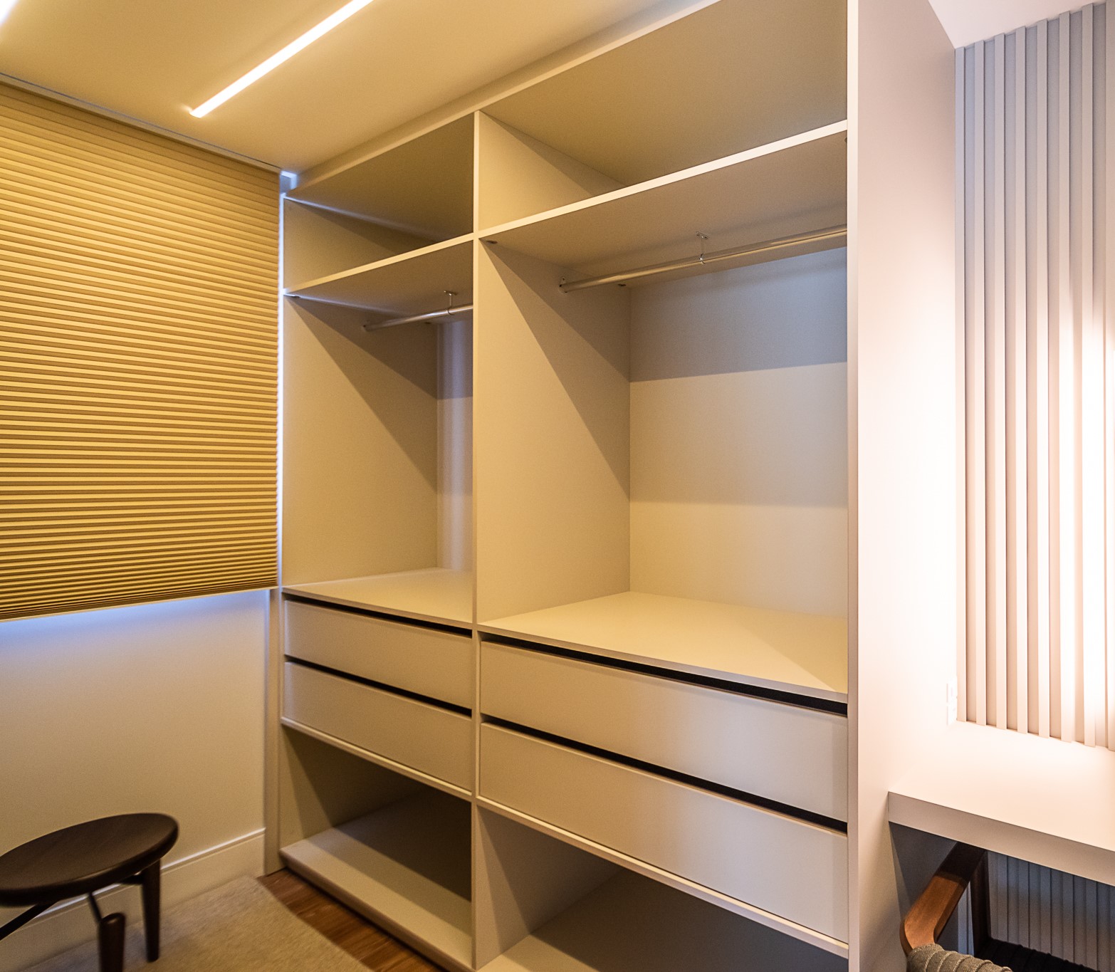 A base neutra dos acabamentos e móveis planejados proporciona equilíbrio e sofisticação, enquanto o mobiliário selecionado ganha destaque ao ser complementado por peças decorativas que imprimem personalidade e charme ao ambiente.